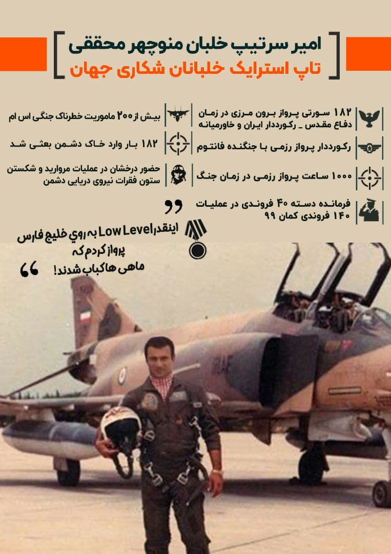 〽️ | اینفوگرافی سرتیپ خلبان منوچهر محققی 13 - مهر - 1400 نگاهی به سوابق درخشان کاپیتان منوچهر محققی تاپ استرایک خلبانان شکاری جهان نوشته های مشابه روسیه جنگندههای جدید سوخو-۳۴ را تحویل گرفت ناو هواپیمابر فوجیان چین؛ غول جدید دریا