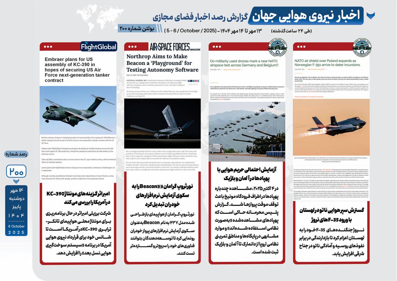 امبرائر گزینههای مونتاژ KC-390 در آمریکا را بررسی میکند نورتروپ گرومن «Beacon» را به سکوی آزمایش نرمافزارهای خودران تبدیل کرد آزمایش احتمالی حریم هوایی با پهپادها در آلمان و بلژیک گسترش سپر هوایی ناتو در لهستان با ورود F-35های نروژ