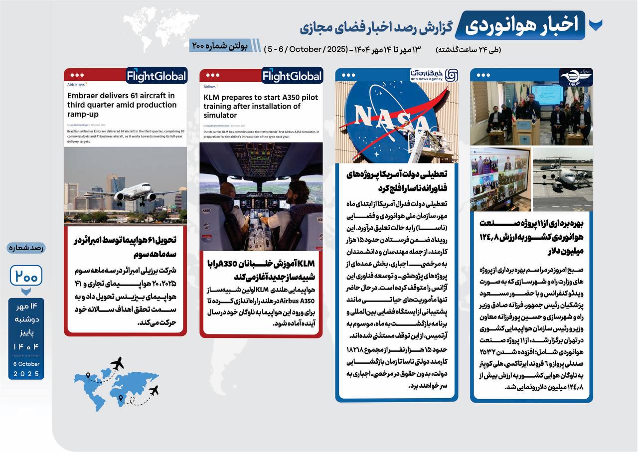 تحویل ۶۱ هواپیما توسط امبرائر در سهماهه سوم KLM آموزش خلبانان A350 را با شبیهساز جدید آغاز میکند تعطیلی دولت آمریکا، پروژههای فضایی ناسا را متوقف کرد بهرهبرداری از ۱۱ پروژه صنعت هوانوردی کشور به ارزش ۱۴۷.۸ میلیون دلار